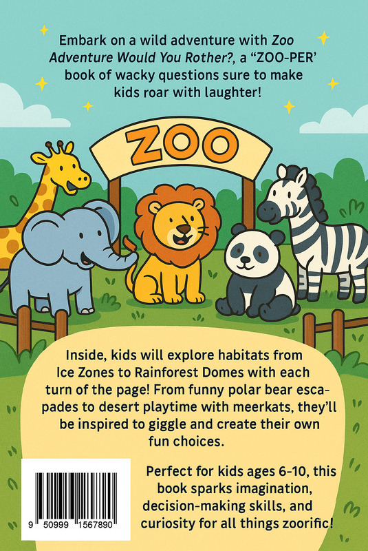 Packed with 200+ hilarious animal questions and 60 fun coloring images, Zoo Adventure Would You Rather? takes kids ages 6β10 on a journey through amazing zoo habitats like the Ice Zone, Rainforest Dome, Desert Dunes, and more!